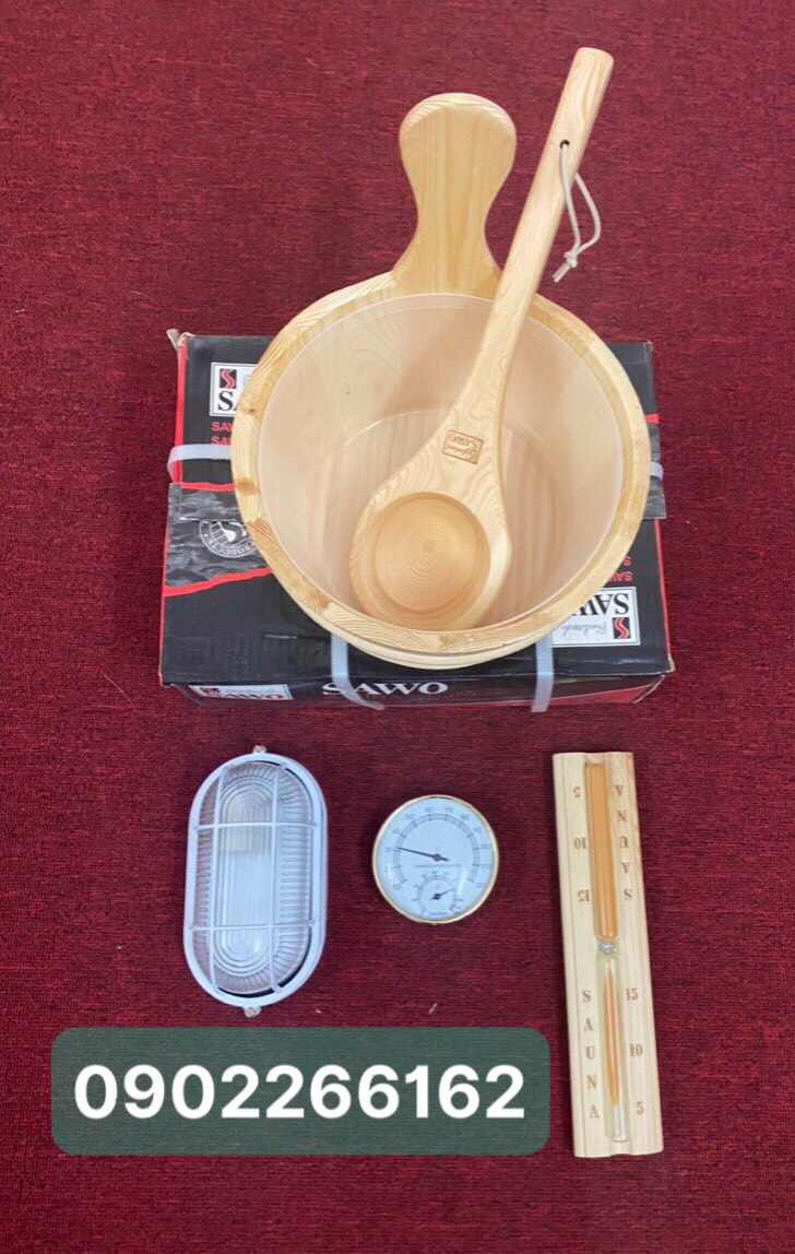 Bộ phụ kiện phòng xông gồm: 01 đồng hồ cát, 01 ẩm kế nhiệt kế, 01 đá sauna, 01 bộ xô gáo gỗ, 01 đèn chống nổ + bao đèn...