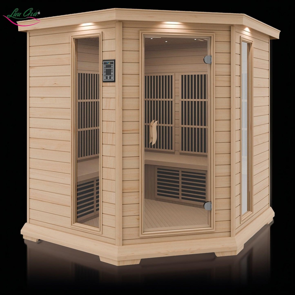 Phần khung và vách phòng được làm từ gỗ Hemlock Canada, giúp giữ nhiệt tốt và tạo không gian kín ổn định. Ghế ngồi bên trong được thiết kế đồng bộ, mang lại cảm giác thoải mái khi sử dụng.